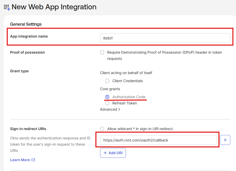 Enter an App integration name and ensure that Authorization Code is checked. Then, enter https://auth.rxnt.com/oauth2/callback as the Sign-in redirect URI.