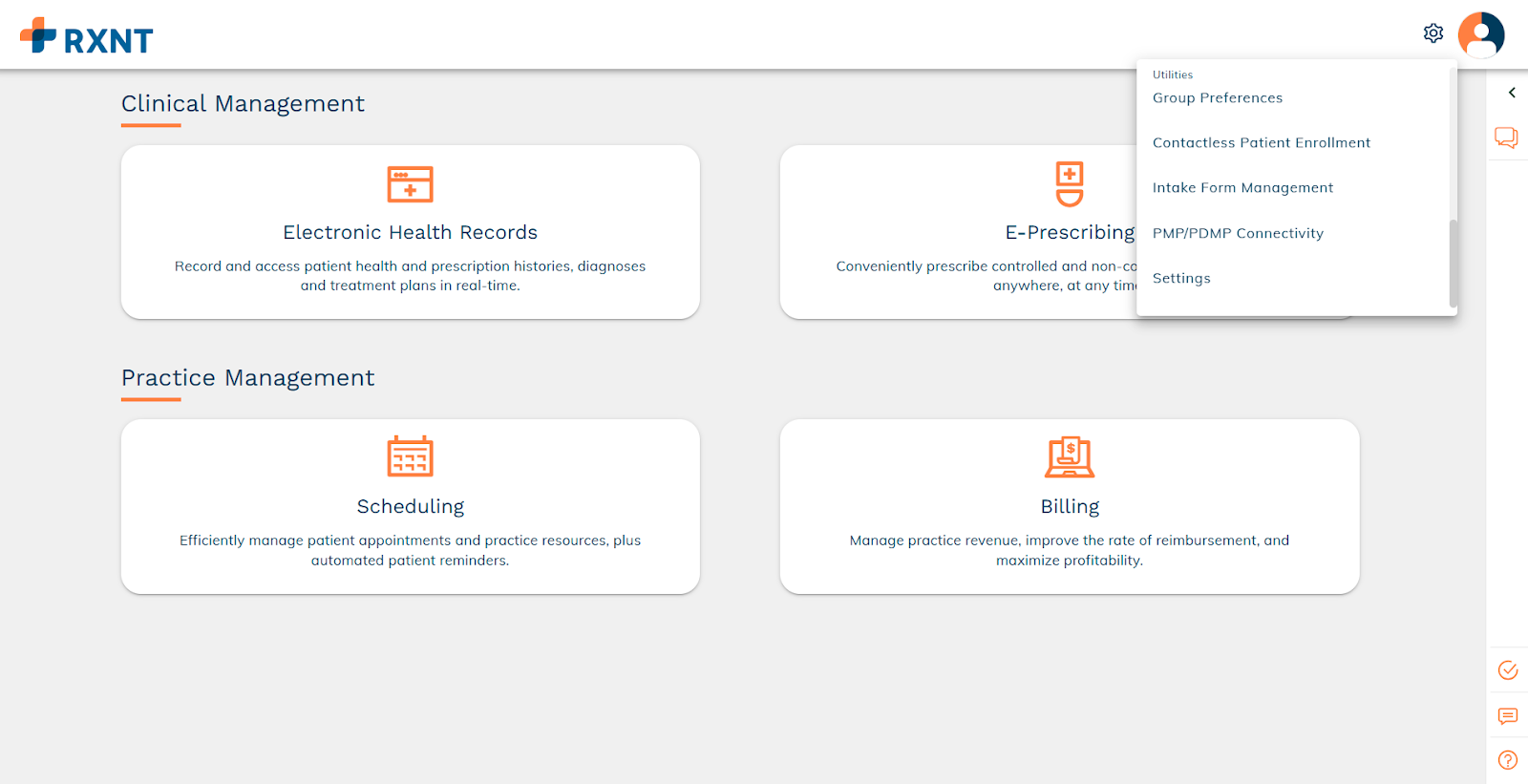 Log in to the RXNT Product Dashboard. In the top right corner, click on the Utilities menu, then click Settings.