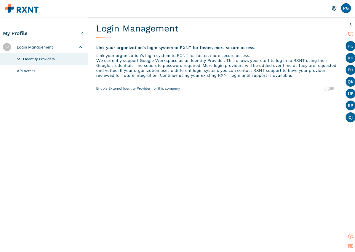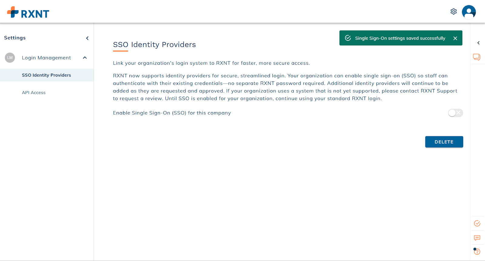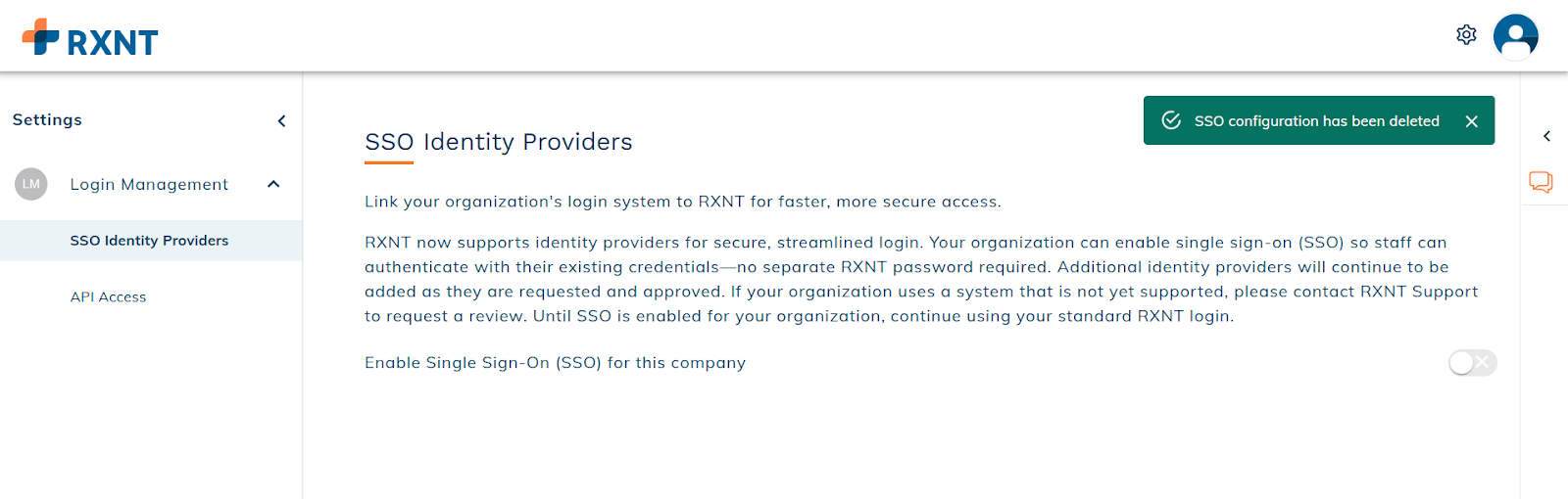 Once disabled, users must sign in using their RXNT credentials until SSO is re-enabled.