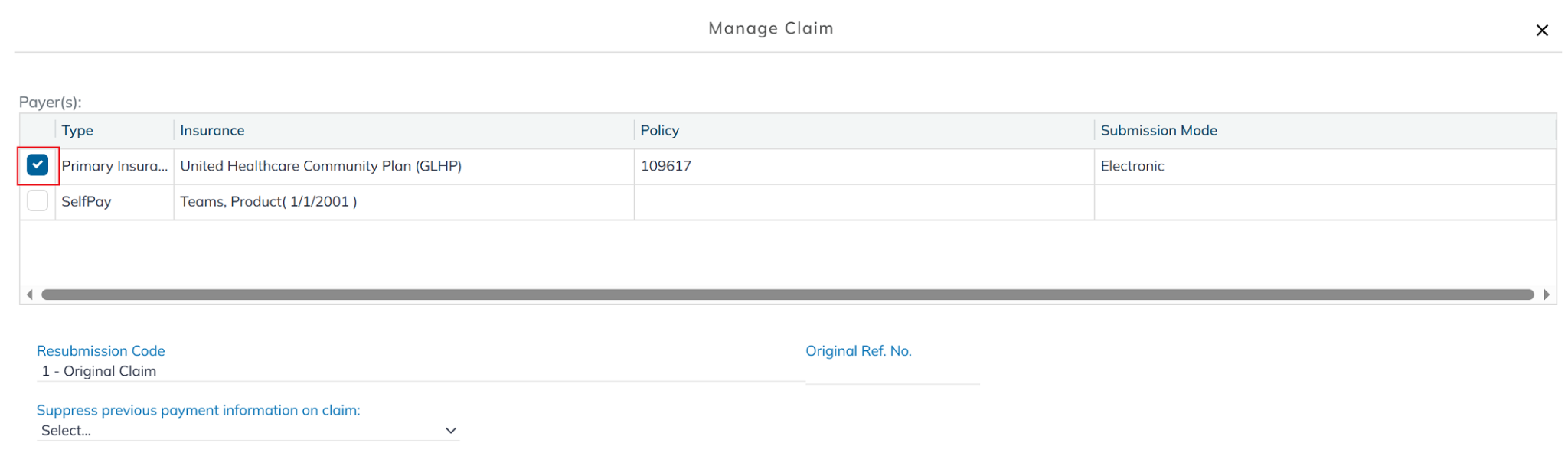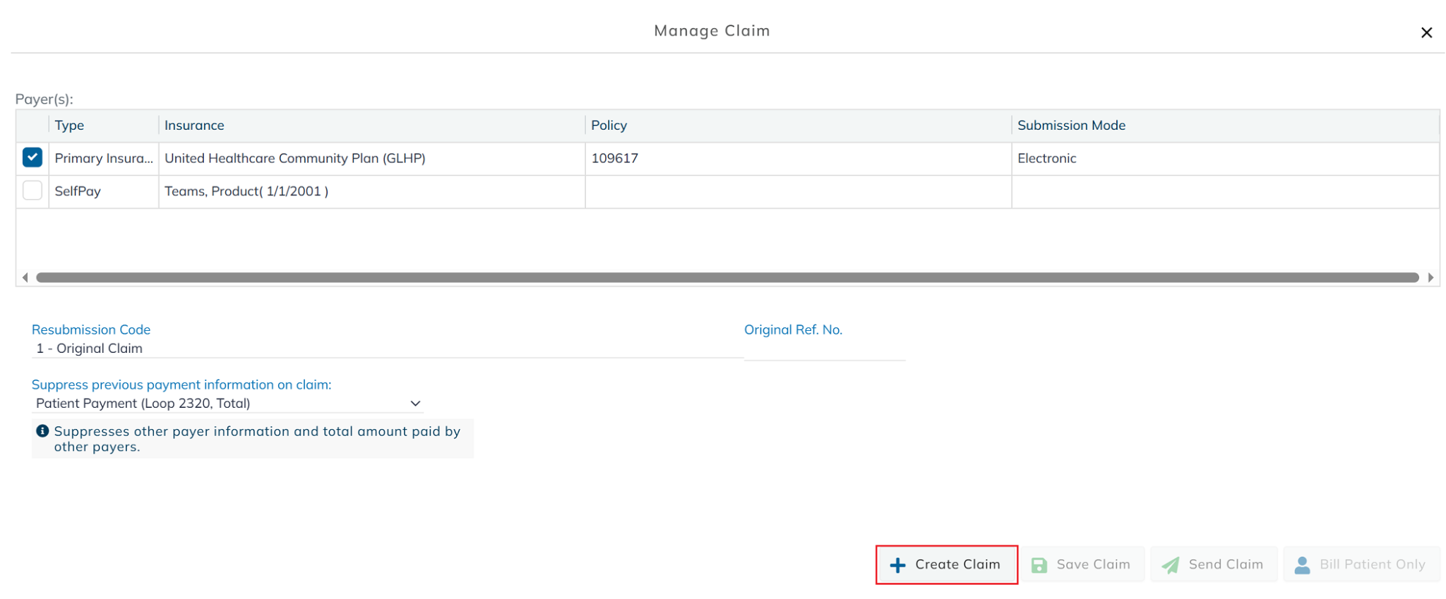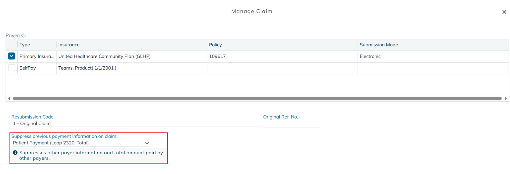 The Suppress Previous Payment Information on a Claim option is available when resubmitting a claim. Use this if a payment has already been posted and you don't want the payment amount included on the resubmitted claim.