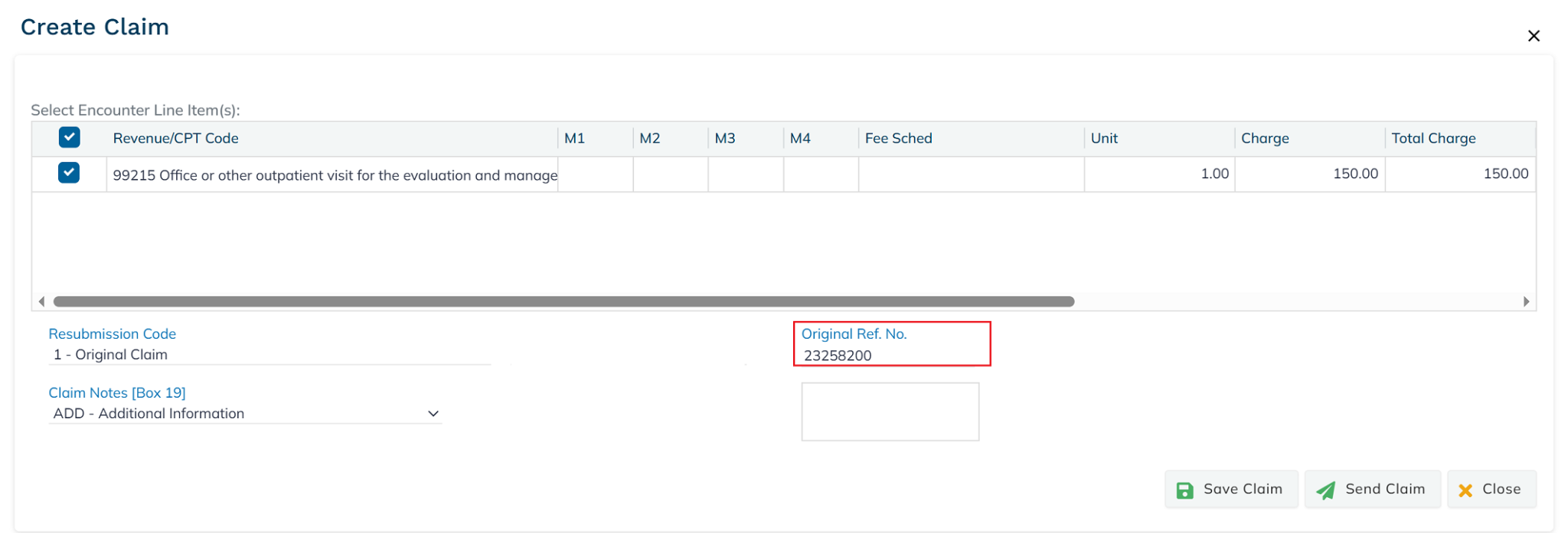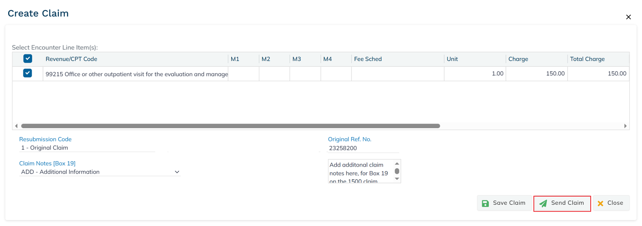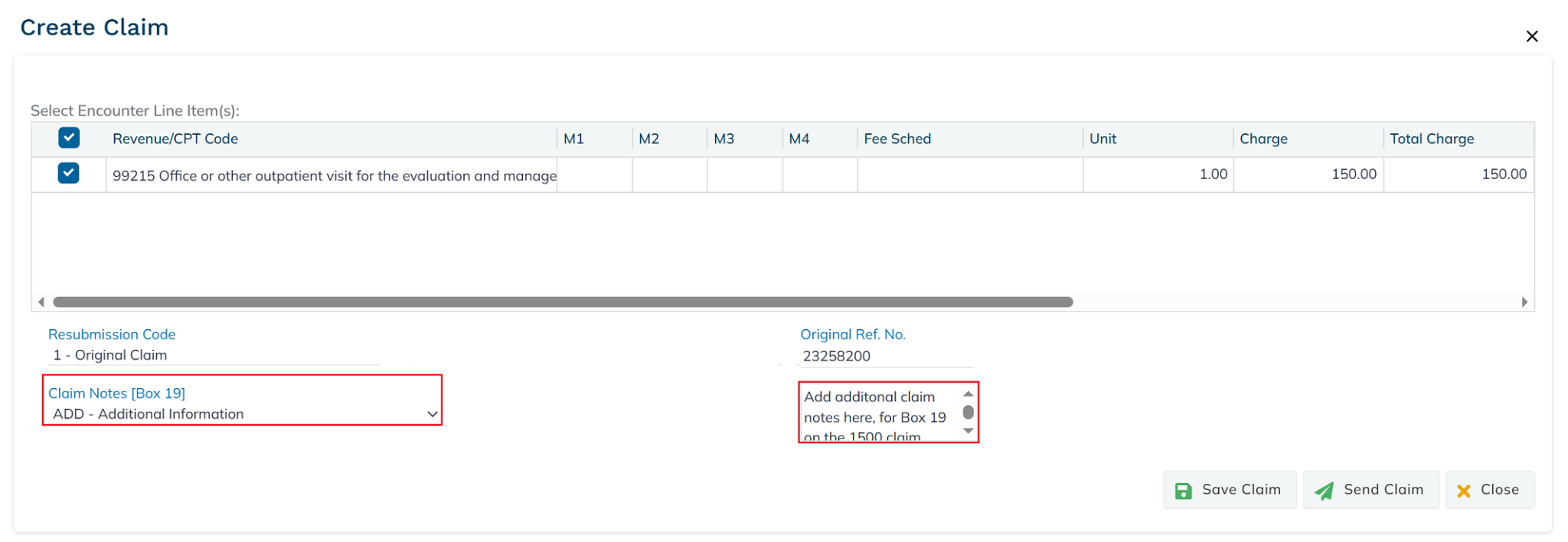 To add additional claim notes in Box 19 on the 1500 claim form, select the desired option from the Claim Notes drop-down menu and enter the details in the field.