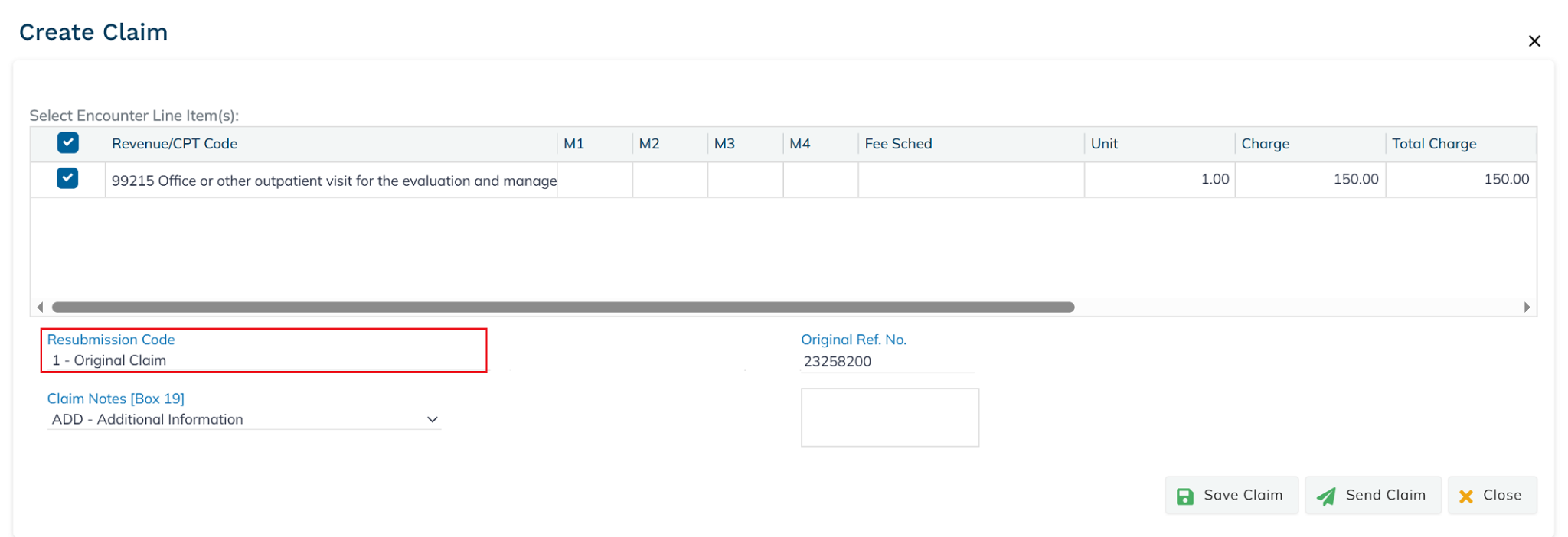 On the Create Claim screen, choose the appropriate Resubmission Code from the drop-down menu.