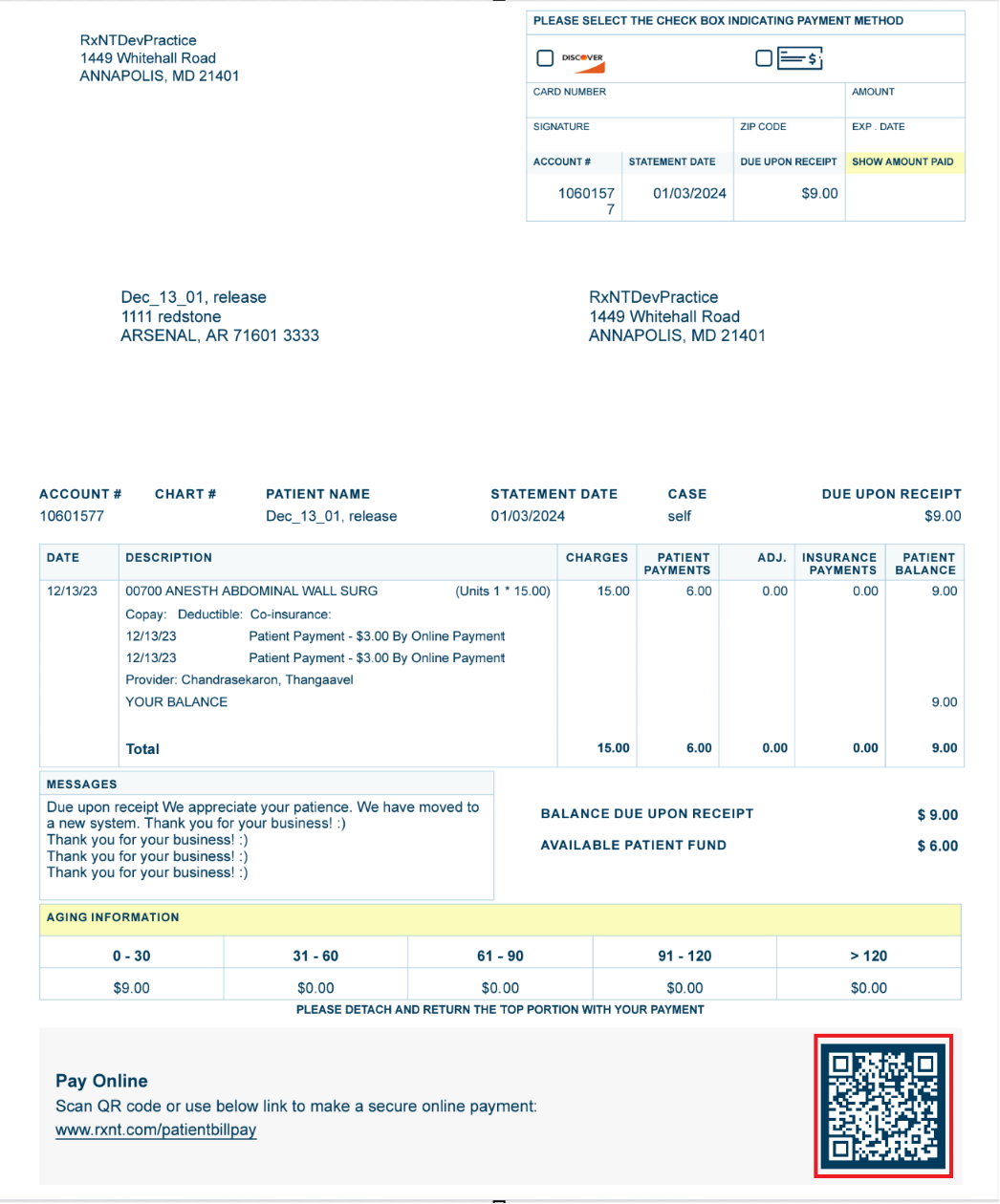 Patient statements include a QR code (Quick Response code) that provides fast, convenient access to online payment options. By scanning the QR code with their smartphone’s built-in camera, patients are directed to their account where they can securely view their balance and make a payment.
