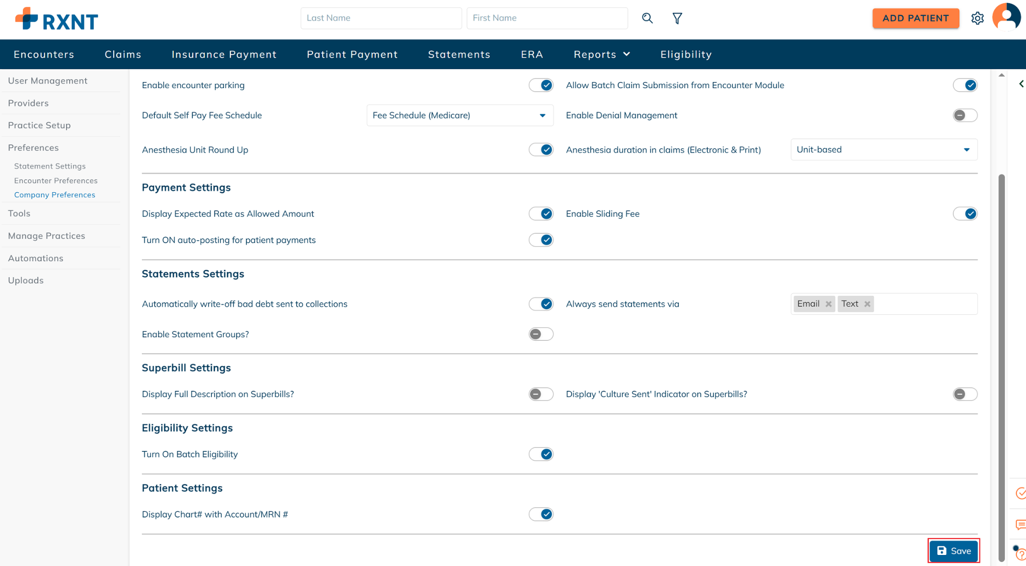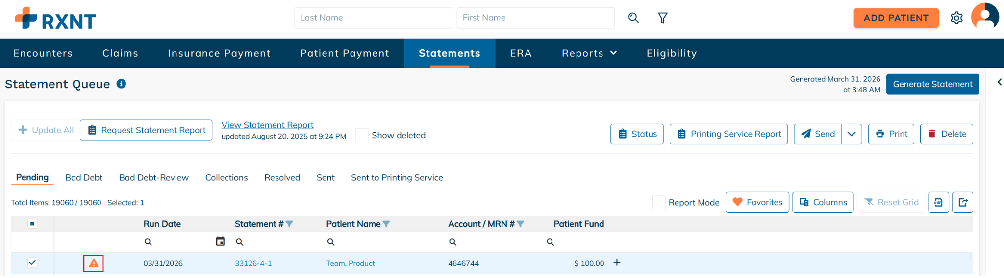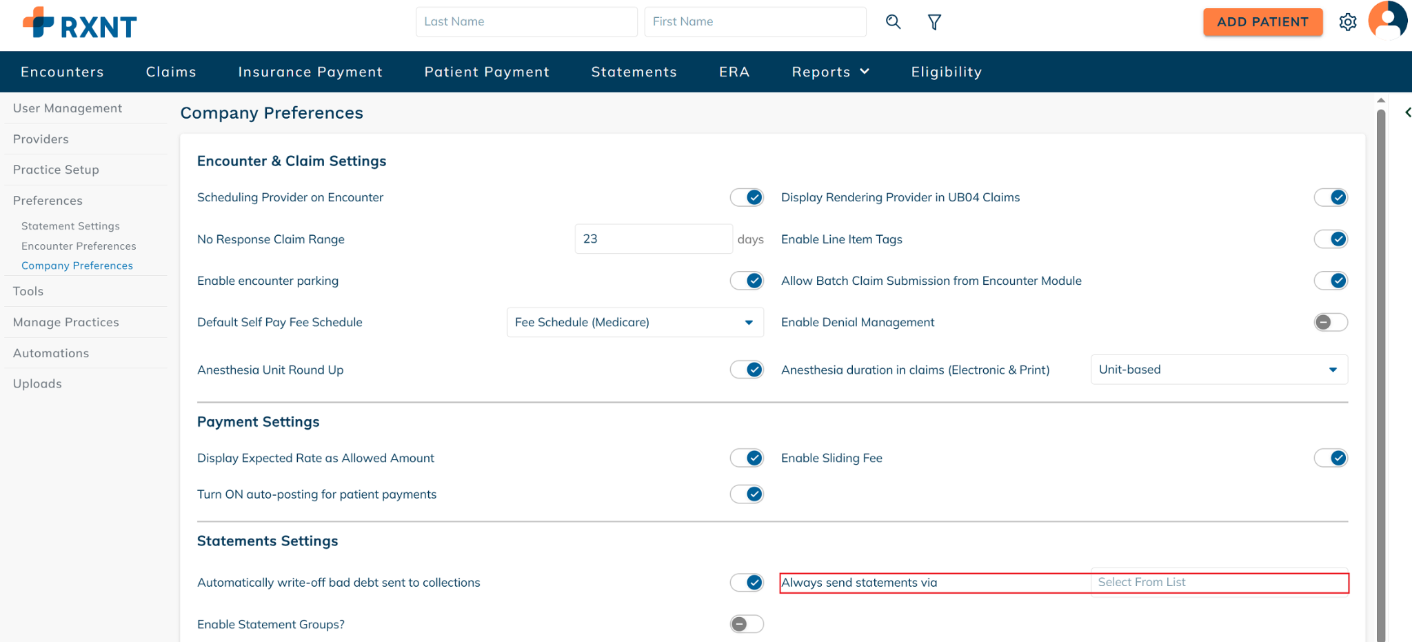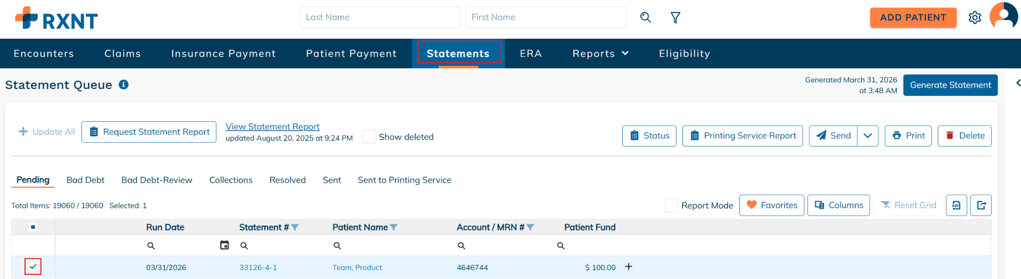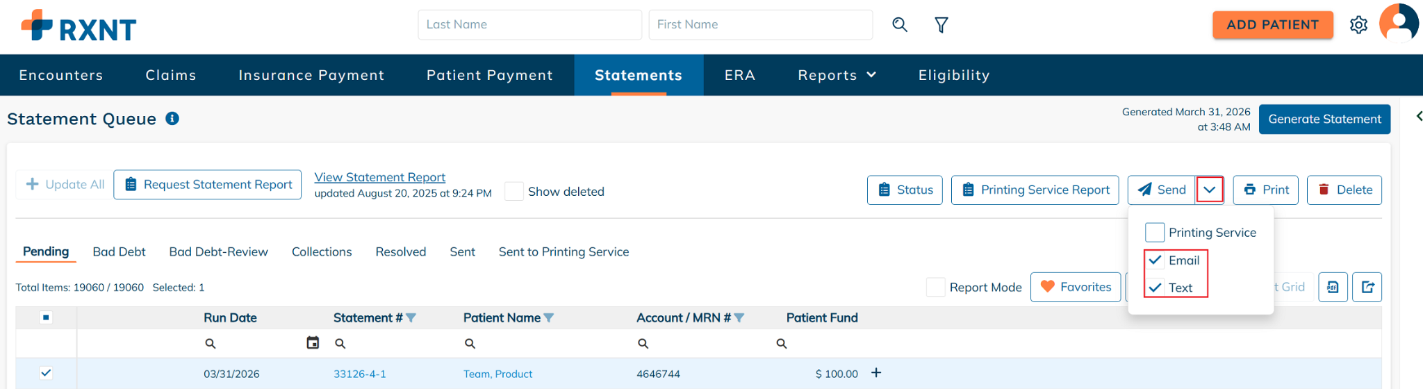 After configuring your company preferences, you can send statements via email and/or SMS by navigating to the Statements screen. Click the checkbox next to the patient, or patients, you want to send statements to.