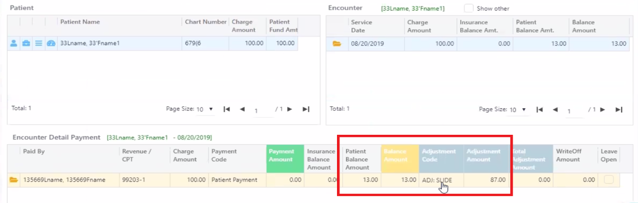 Assume you charge them $100 in an encounter. They will pay $13, with an adjusted amount of $87. Below, the sliding fee has been applied, and the patient balance is $13, which was calculated based on the master sliding fee. We can also see the adjusted amount is $87.