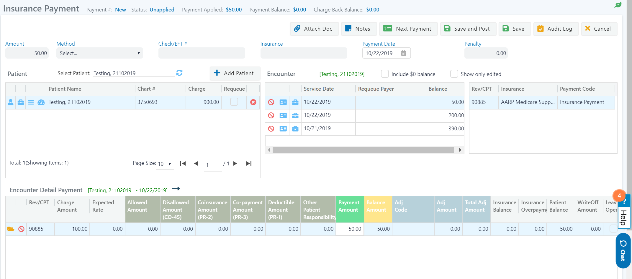 Be sure to save the encounter. In this example, assume insurance covers $50.
