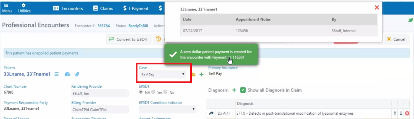Once you have completed the necessary information, click “Save.” A pop-up will appear: "A zero-dollar patient payment is created for the encounter..." as seen below.