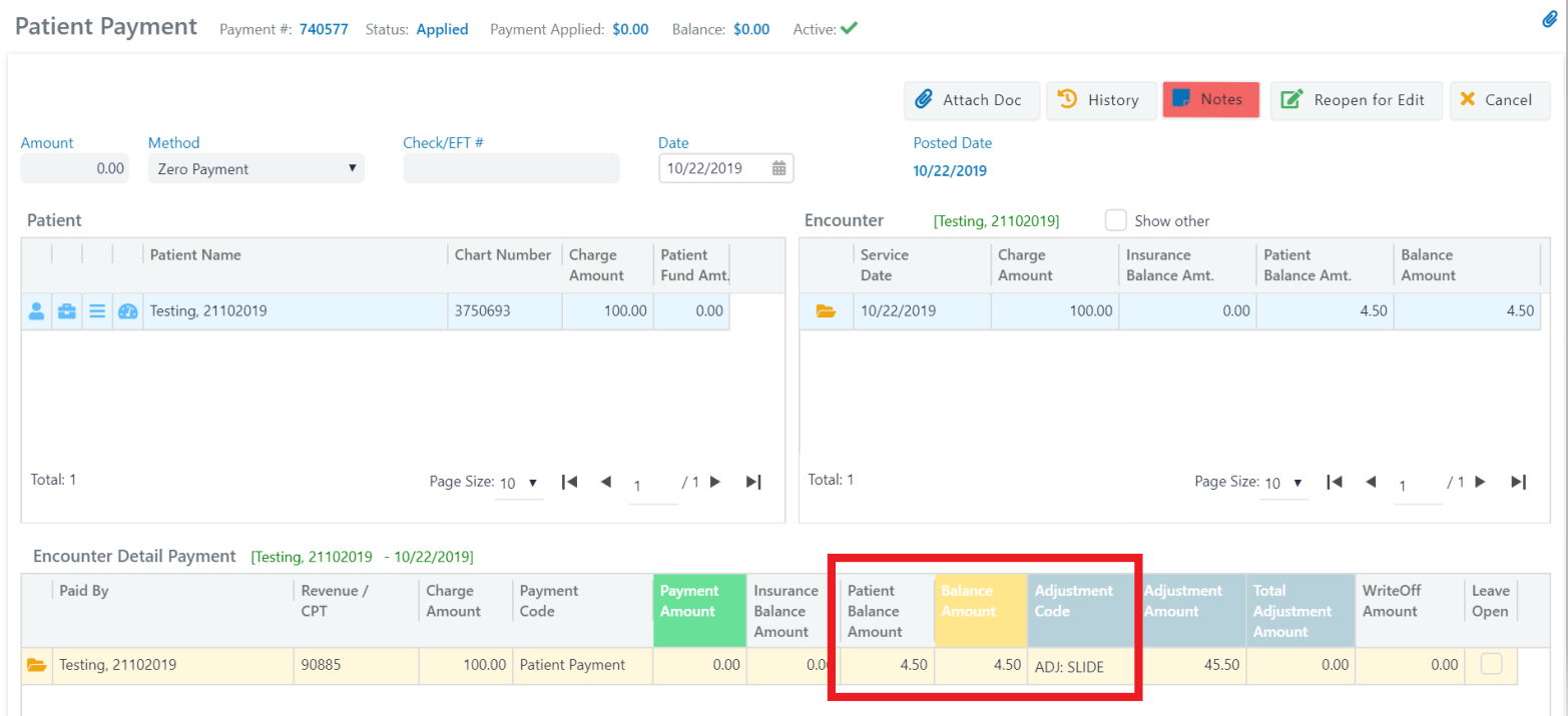Note: The adjustment code ADJ: SLIDE indicates that this was a sliding fee adjustment.