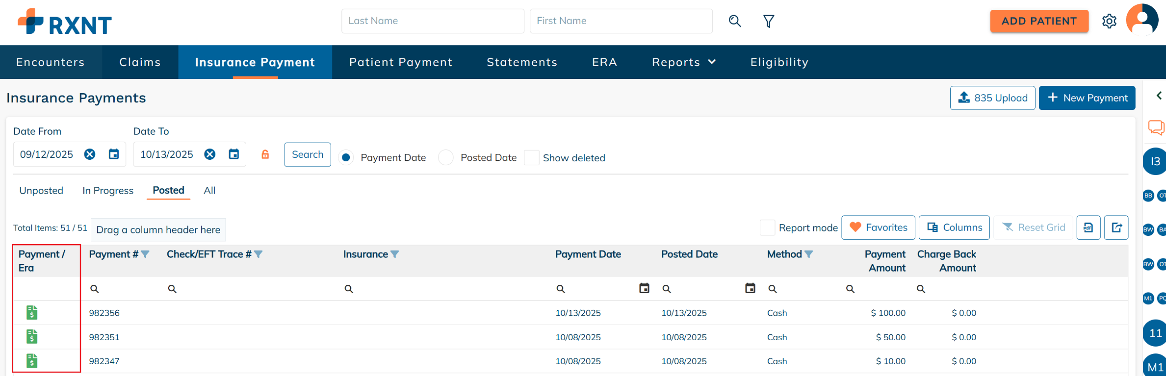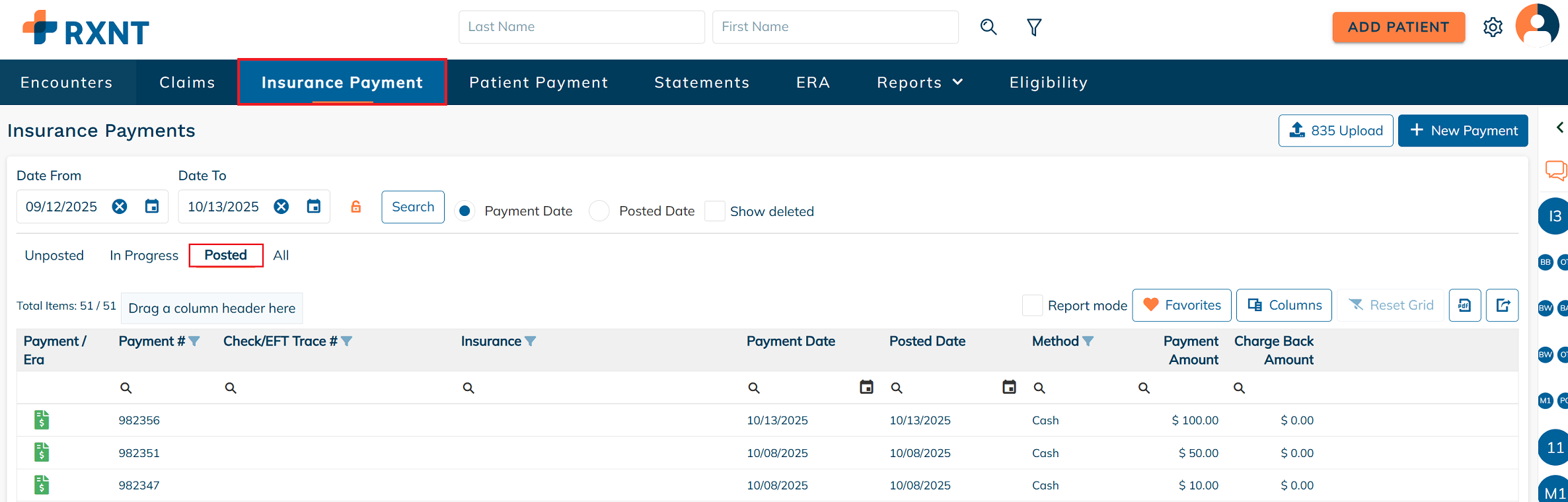 Begin by navigating to the Insurance Payment tab, then click on the Posted tab.