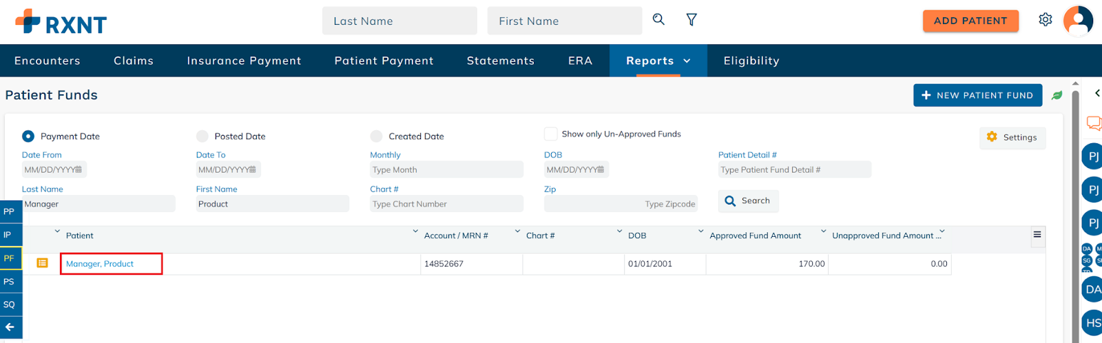 Navigate to the Patient Funds tab.