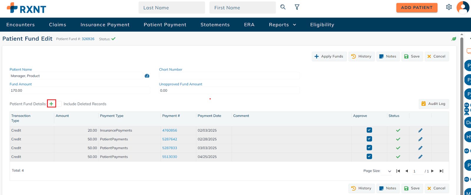 Click the green (+) icon to enter the patient fund details.