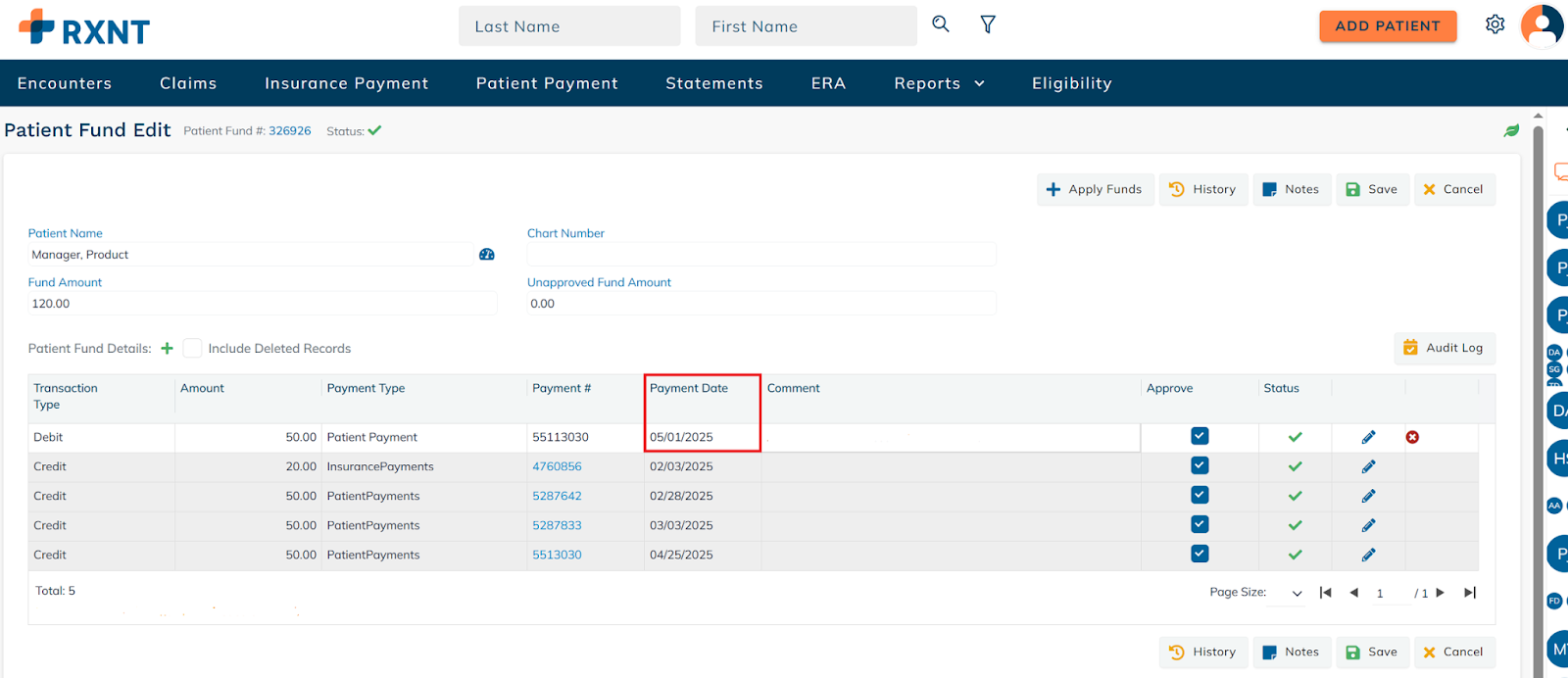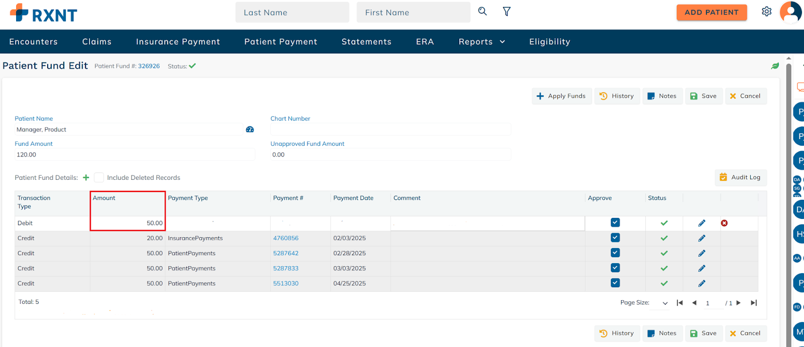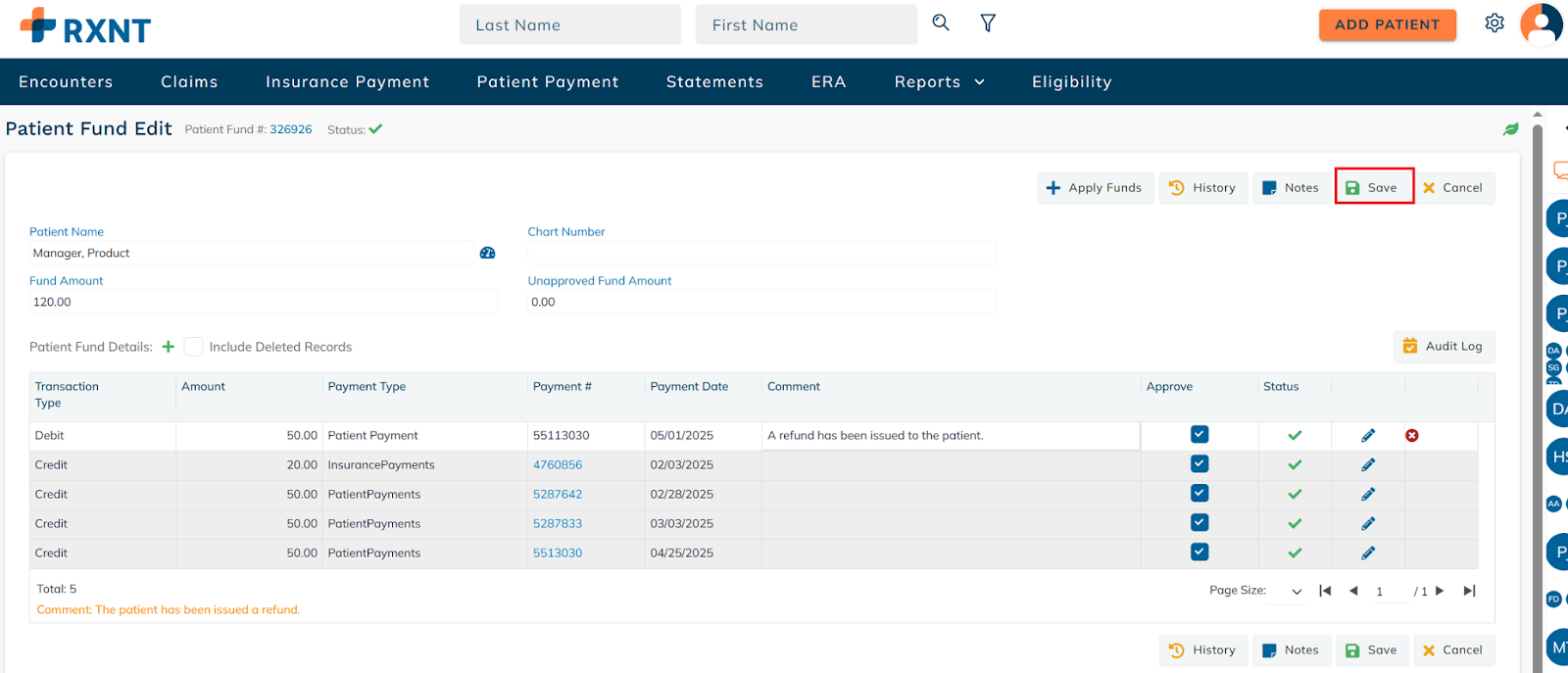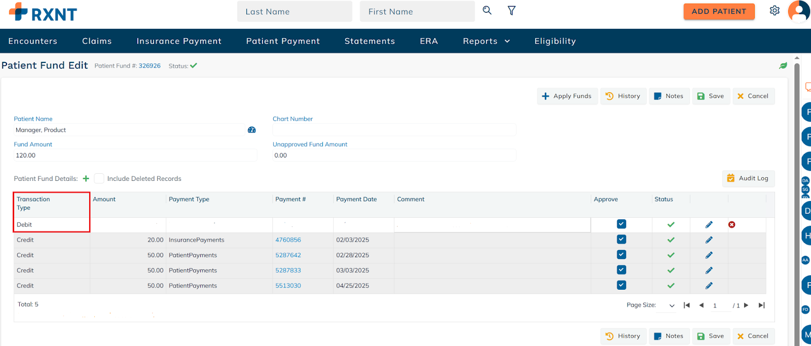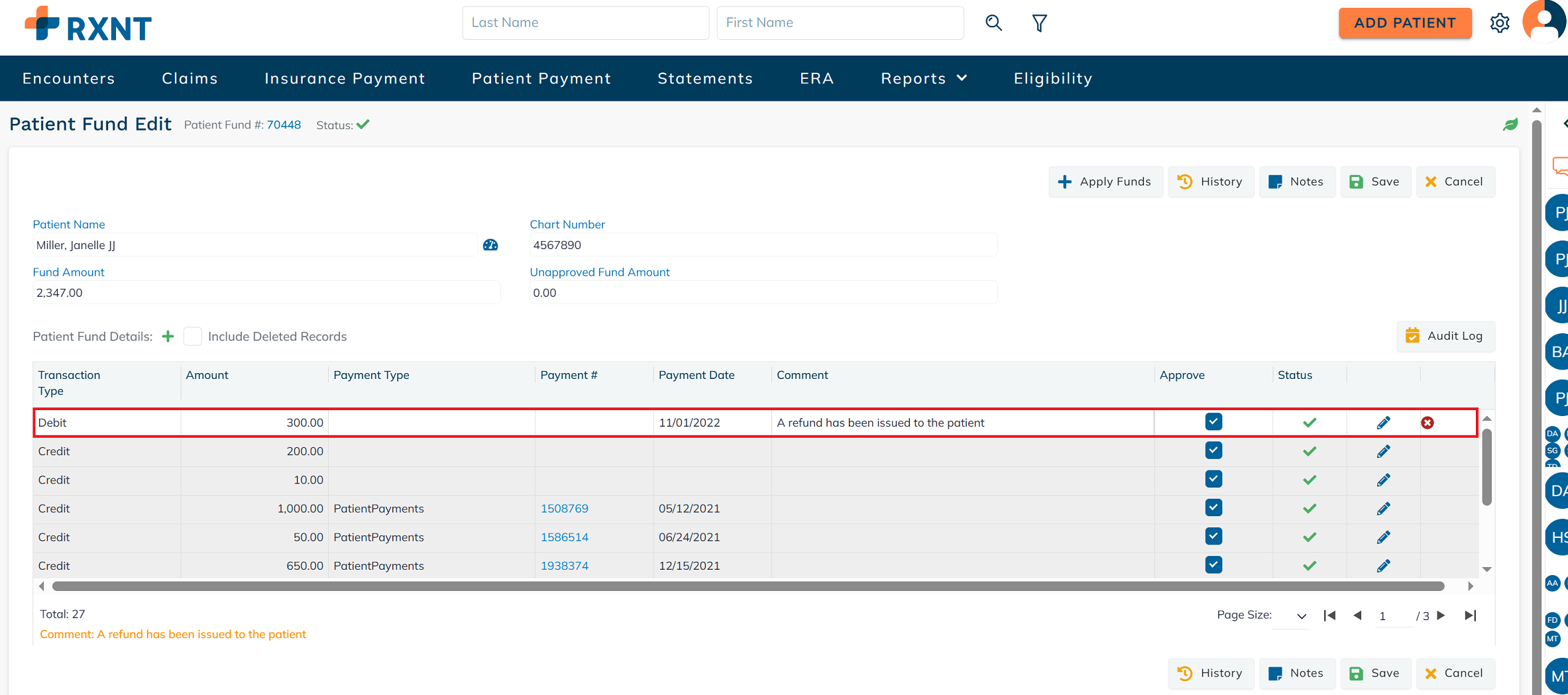 Here, you can see all the patient fund credits and debits.