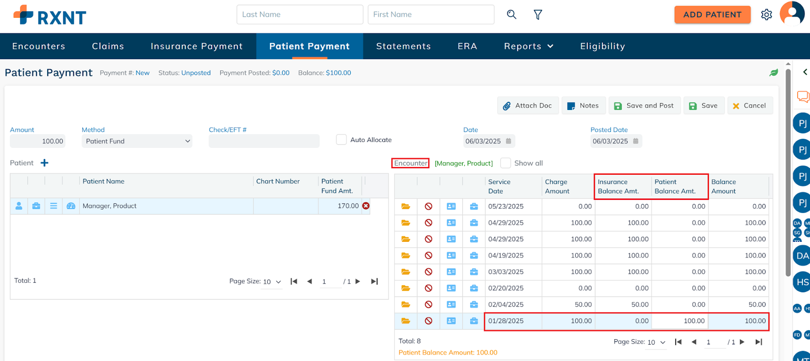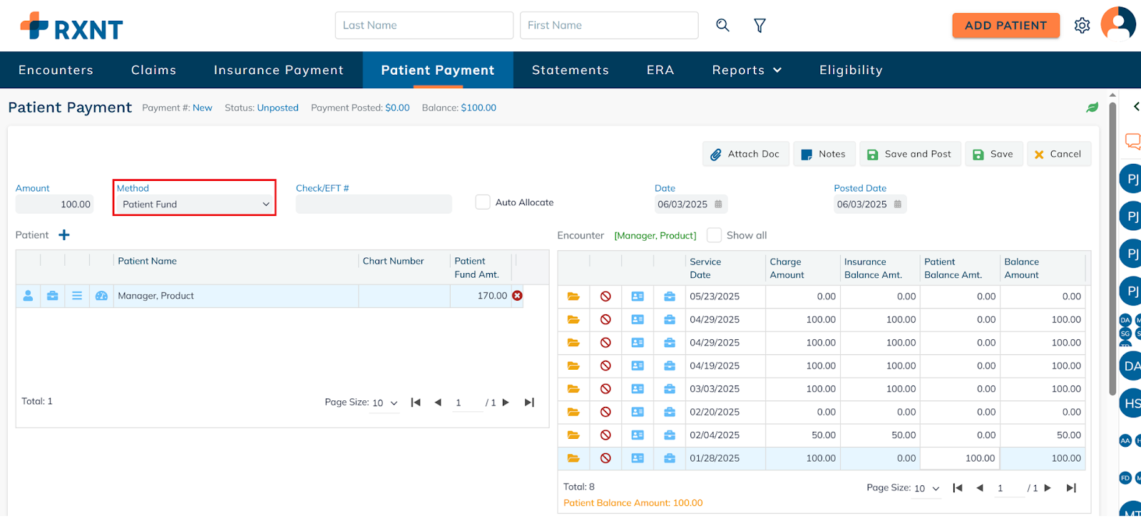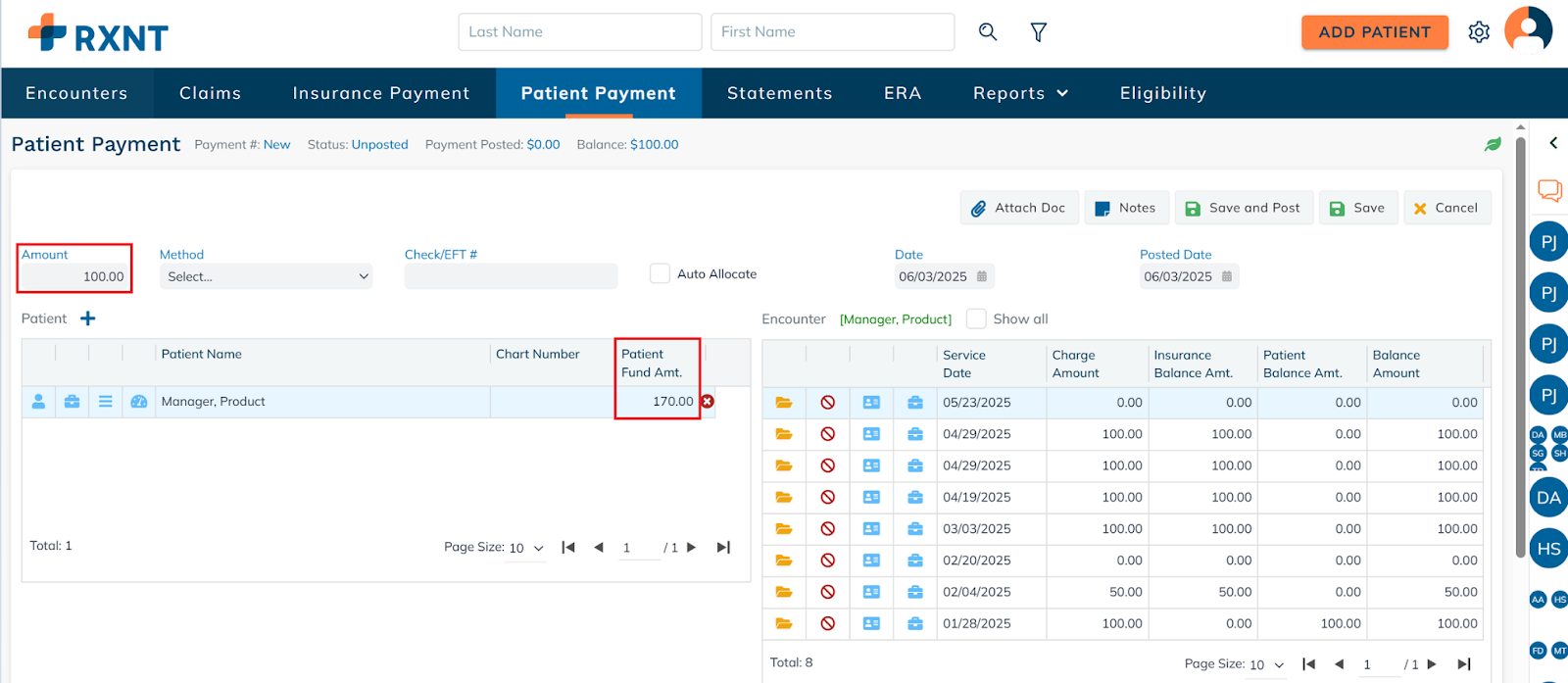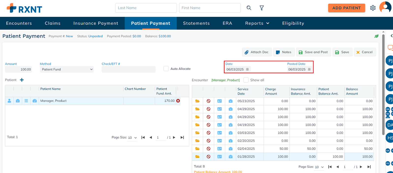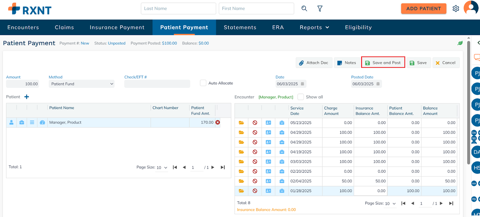 Click Save and Post to apply the patient's funds to the selected date of service.