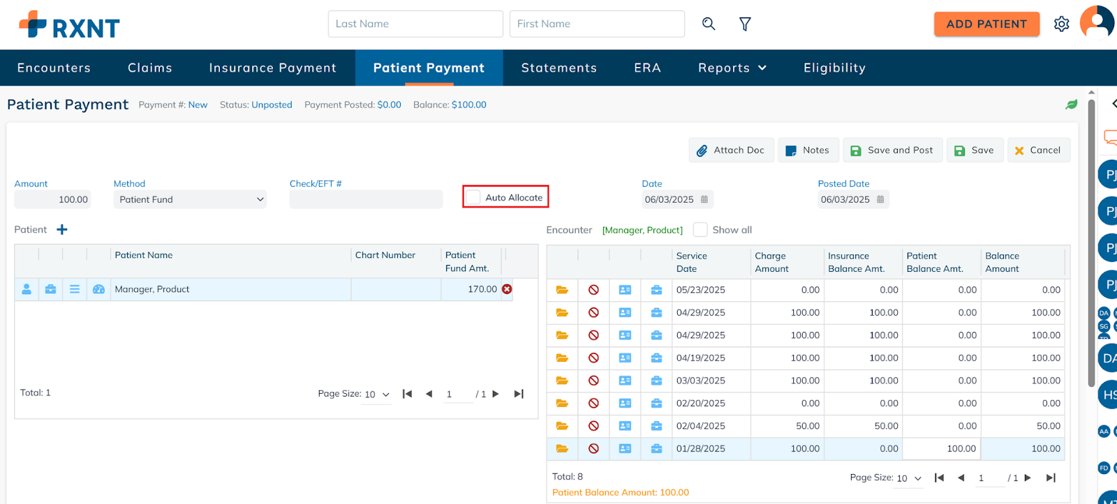 You can select the Auto Allocate checkbox to automatically apply the funds to all dates of service with outstanding balances, starting from the oldest to the newest.