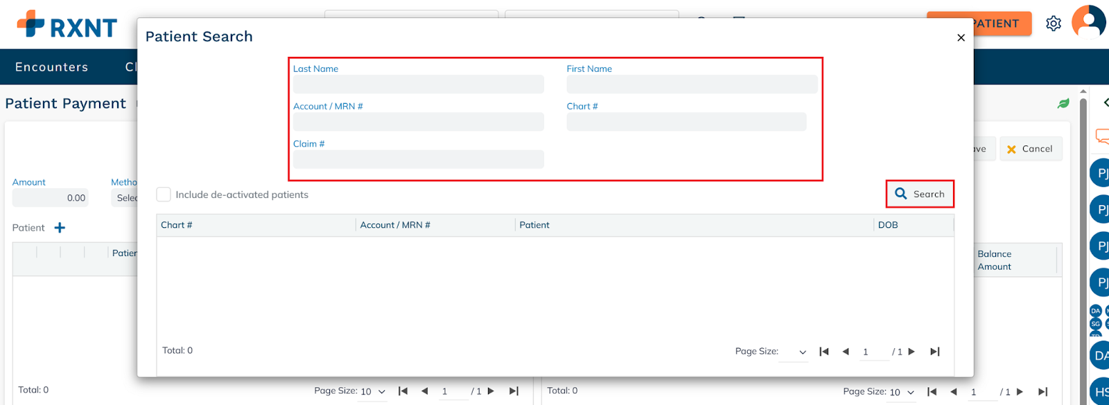 Enter the patient's last name, first name, account/MRN number, chart number, or claim number, then click Search.