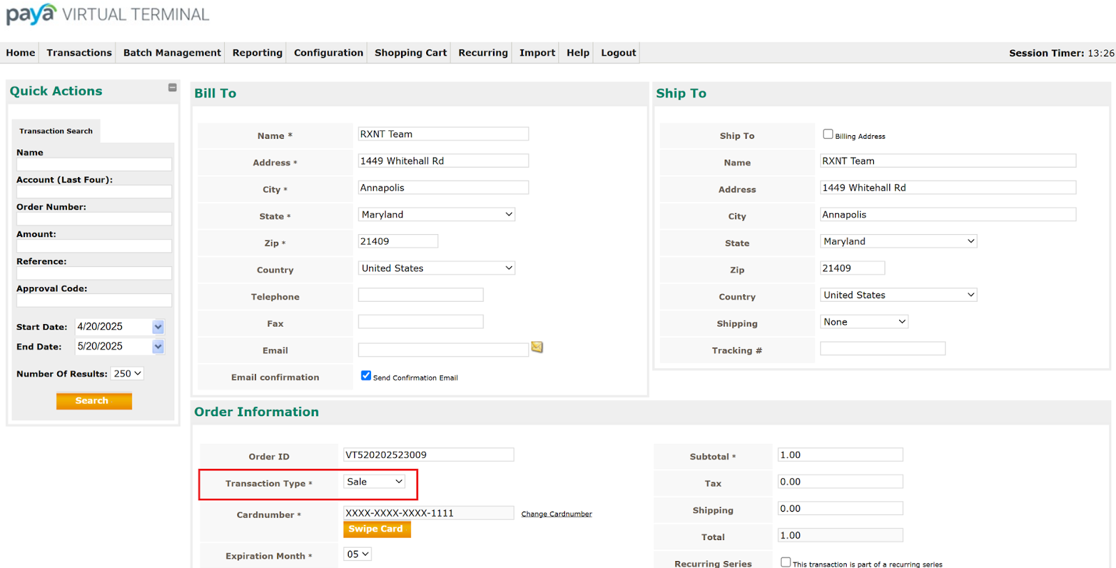 Once logged into your Virtual Terminal, find the transaction you want to refund. The most efficient way to do this is by using the Transaction Search, located in the Reporting menu.
